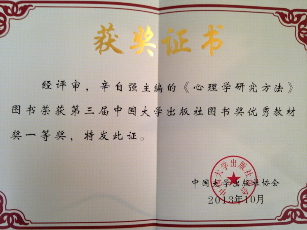 近日,在中国大学出版社协会主办的“第三届届中国大学出版社图书奖”评选中,我校社会发展学院副院长辛自强教授的专著《心理学研究方法》荣获优秀教材一等奖。