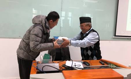 (图1:包胜勇老师代表中国海外发展研究中心接受G.M.Gurung教授赠书)