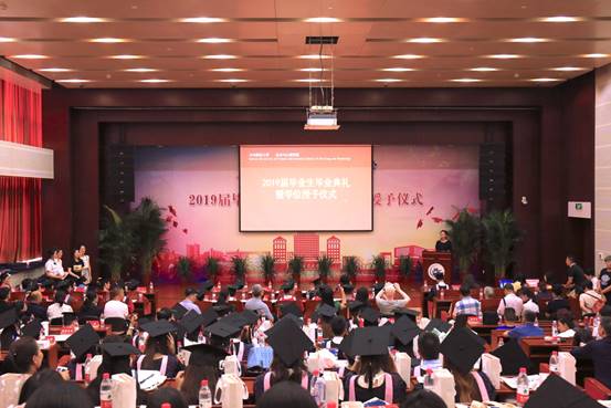 首先,在热烈的掌声中学院全体导师缓步进入会场,在毕业典礼正式开始之前,全体师生及亲友观看了由毕业班精心准备的2019届毕业纪录片。纪录片展现了毕业生们在校期间丰富多彩的生活,勾起了同学们温馨美好的回忆。
