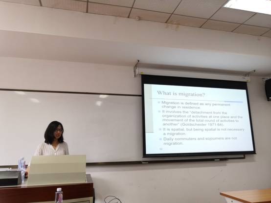 同钰莹老师介绍了人口迁移的测量指标、人口迁移的原因和后果以及关于人口迁移的主要理论。同老师首先从“什么是人口迁移?”这个问题开始,指出测量人口迁移时,要考虑时间和距离的概念。同老师认为迁移不仅会影响迁移者本身,还会影响迁移者的家庭和所处的城市,所以研究人口迁移问题十分重要。接下来,同老师比较了永久性迁移和临时性迁移、国内和国际迁移、迁移流和迁移量等概念的区别,让同学们对有关迁移的概念有了更加全面和深刻的认识。之后,同老师对一些经典的迁移理论进行了讲解,如推拉理论、古典经济学理论、新迁移经济学理论和双重劳动力市场理论等等。并且指出了这些理论的使用范围和不足。最后,同老师从宏观和微观两个角度阐释了人口迁移所带来的影响,以及这种影响在不同时期和地域的动态变化。