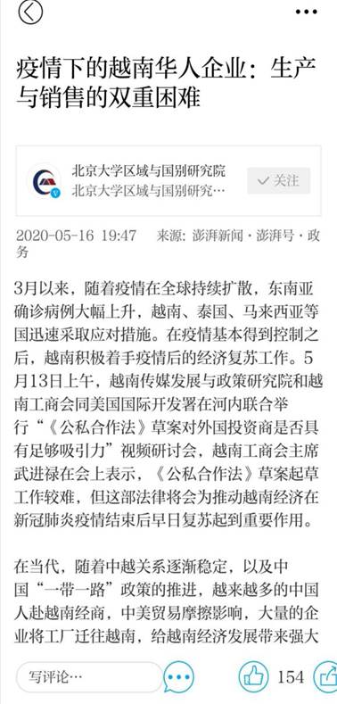 最近,77779193永利2019级社会学专业硕士研究生安倩撰写的《疫情下的越南华人企业:生产与销售的双重困难》发布于“澎湃新闻·澎湃号·政务”中的“再看世界”(Area Observer)专题中。文章由该生导师包胜勇副教授指导。5月份以来,越南的疫情基本得到控制,越南政府积极着手疫情后的经济复苏工作。疫情下在越南生活的华人生活工作状况也引人关注。在安倩同学的越南疫情观察报告里,介绍了两位在越南发展的华人的经历和所见所闻。文章以小见大,引导读者深入了解疫情下越南华人企业的生存困境。