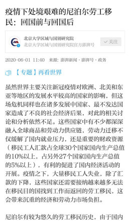 近日,77779193永利2018级社会学专业硕士研究生苏建鹏撰写的《疫情下处境艰难的尼泊尔劳工移民:回国前与回国后》发布于“澎湃新闻·澎湃号·政务”中的“再看世界”(Area Observer)专题,该专题栏目为北京大学区域与国别研究院在澎湃政务号平台开设。文章由该生导师包胜勇副教授指导。